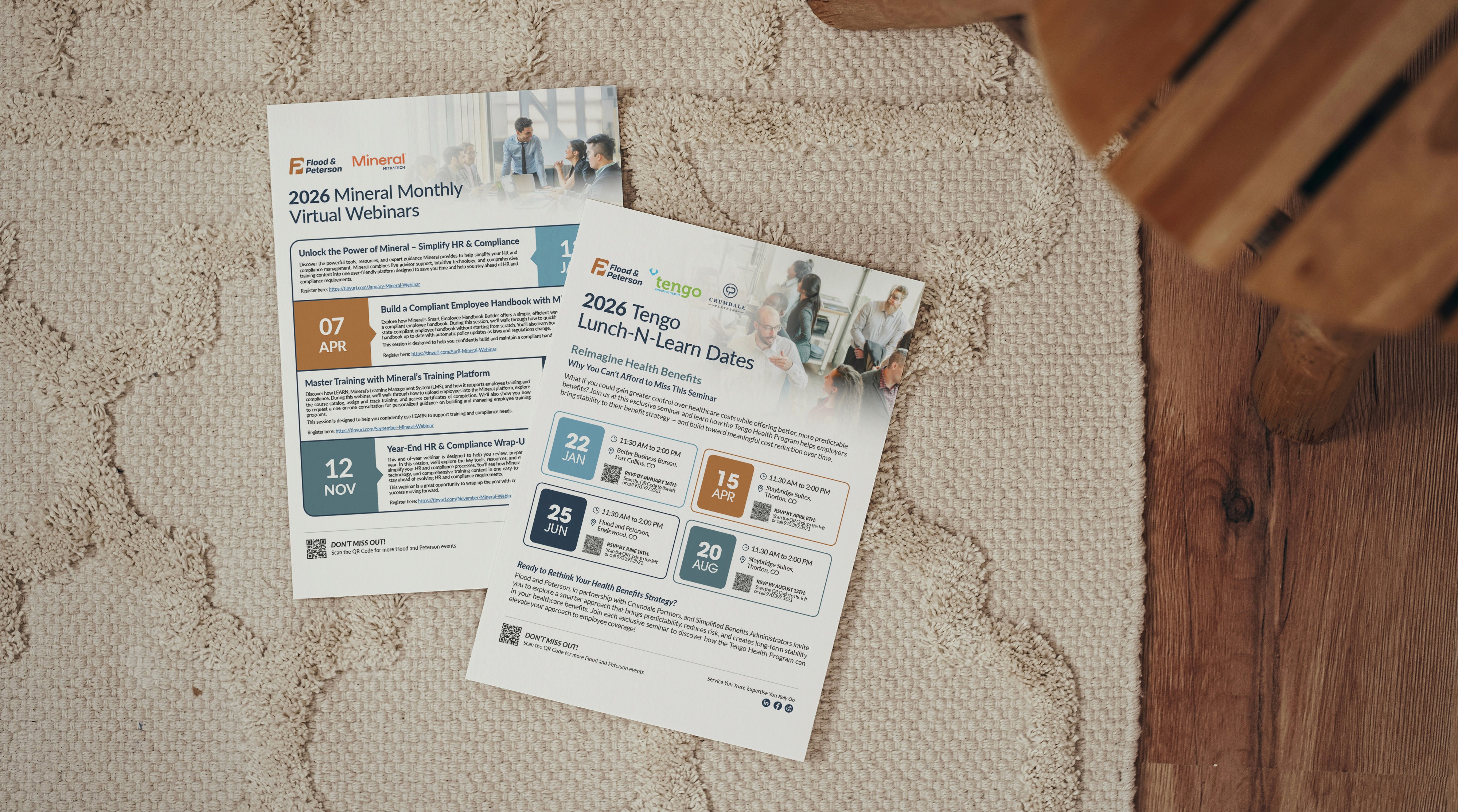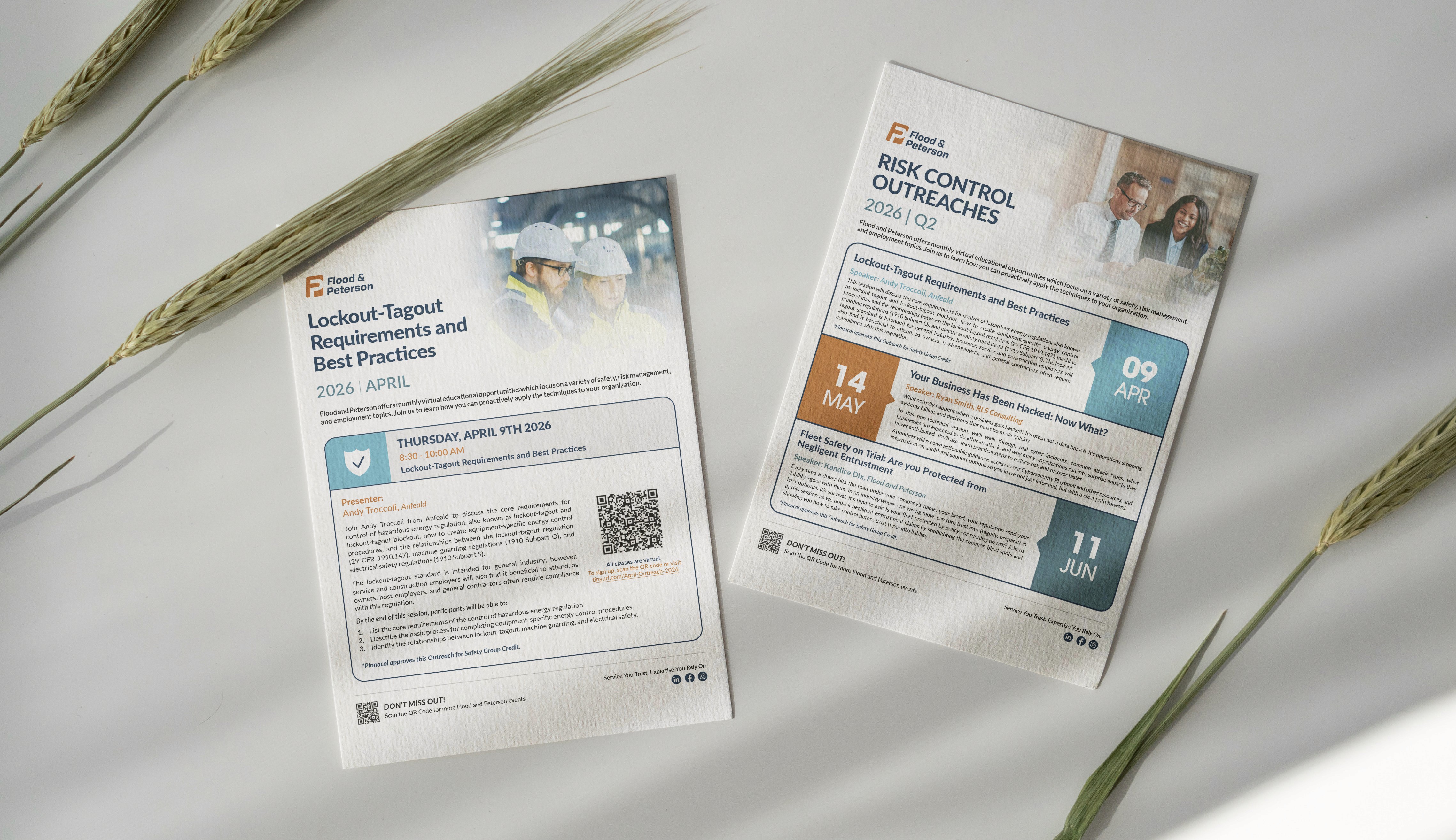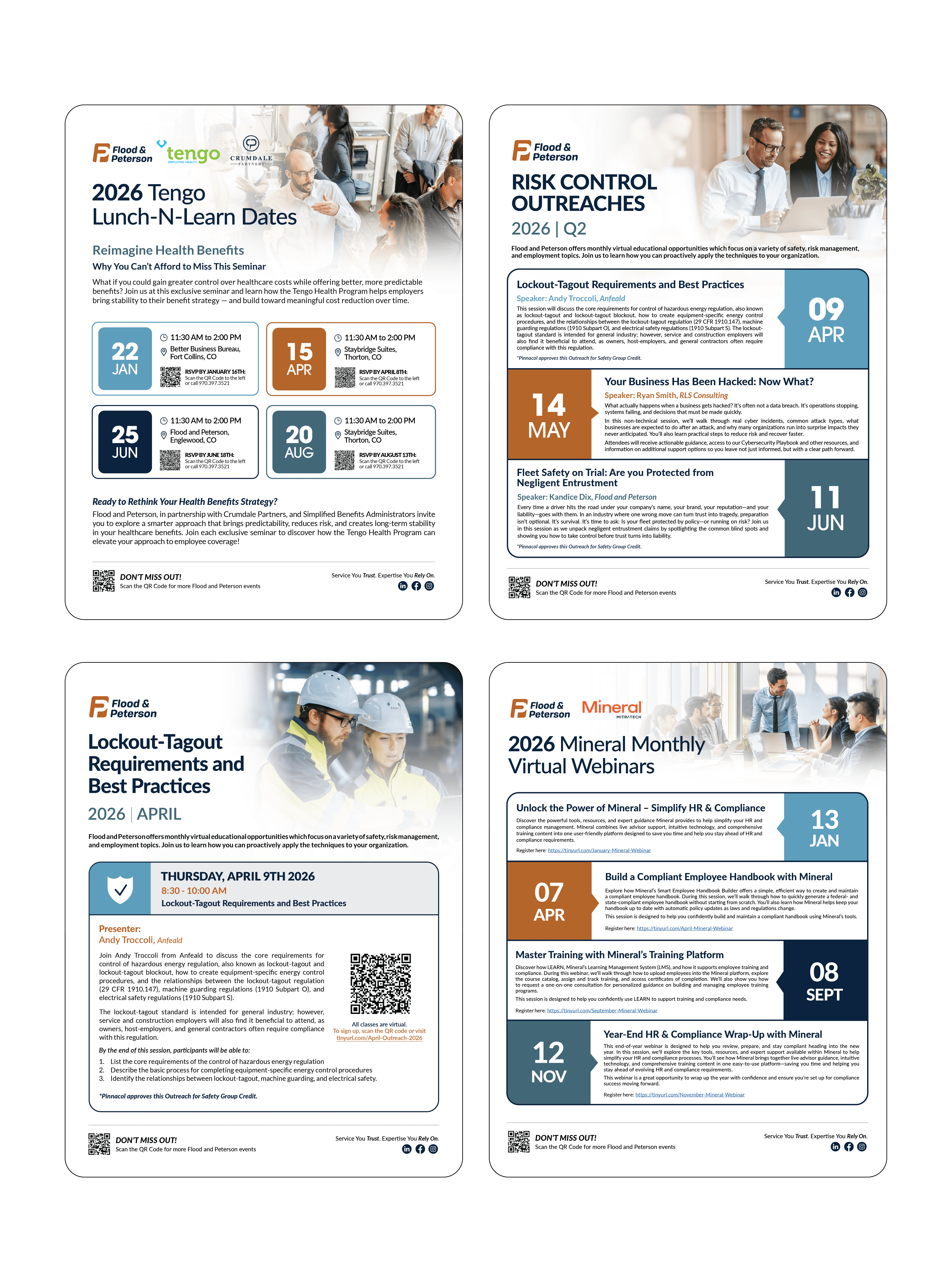 This collection includes event flyers and personalized postcards I designed to support our outreach efforts & sales team at Flood and Peterson. The flyers are created to grab attention and communicate event details, while the postcards give our reps something thoughtful and professional to leave behind at sponsored events. Each piece is designed to feel on-brand and clear.